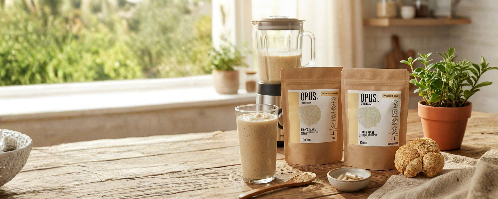 Onze Lion's Mane capsules bieden dezelfde premium kwaliteit in een handige vorm. 100% biologische vruchtlichamen, eenvoudig te doseren en perfect voor onderweg. Ondersteunt cognitieve functies en mentale helderheid.